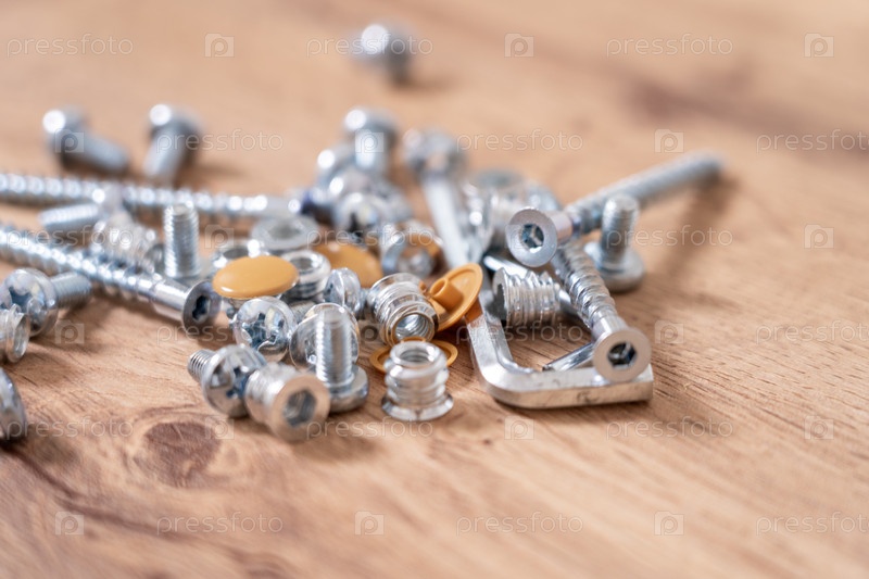 Болты и шестиугольный ключ для сборки мебели на деревянном фоне