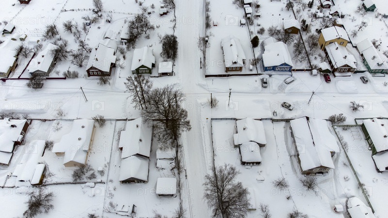 Снежный жилой квартал. деревня в глубинке России на зимний вид сверху. большие снежные заносы много снега