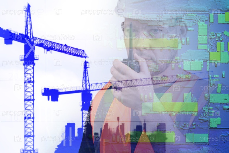 Изображение статистики и анализа данных на строительной площадке и бизнесмена, использующего смартфон. Глобальная концепция бизнеса, анализа данных и технологий в цифровом формате