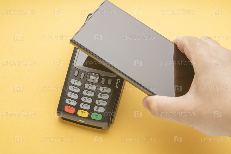Руки держат телефон возле платежного терминала