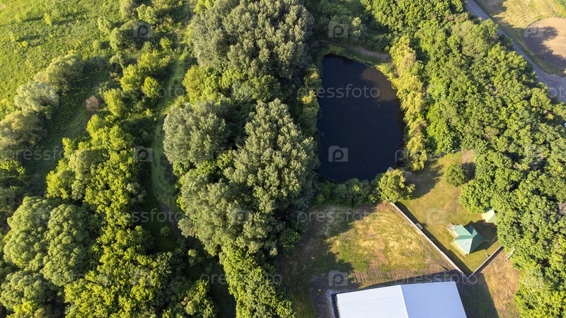 Небольшой пруд возле здания в зеленом лесу вид сверху. деревня. лес. отдых. воздушный зеленый пейзаж