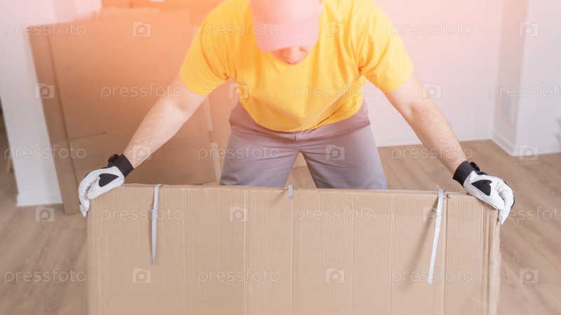 Работник распаковывает мебель из картонных коробок. Мужчина с трудом поднимает большую картонную коробку. Руки захватывают бока, надевая белые перчатки. Яркая желтая рубашка контрастирует с мягким освещением. Нежная улыбка говорит о том, что он сосредоточ
