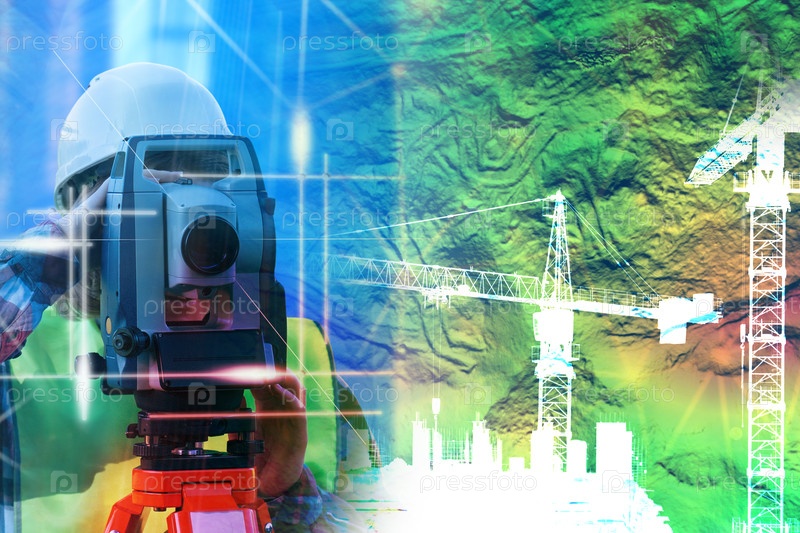 Surveyor эксплуатирует точный инструмент на ярком цифровом фоне