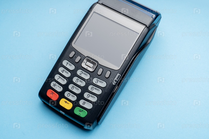 Платежное терминальное устройство. на белом фоне показан терминал кредитной карты. представлен крупный план платежного устройства и карточного автомата