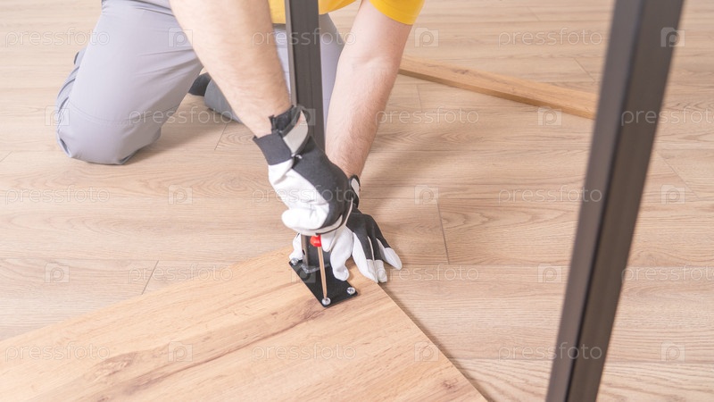Рабочий собирает мебель, собирает стол для рабочих в комбинезонах