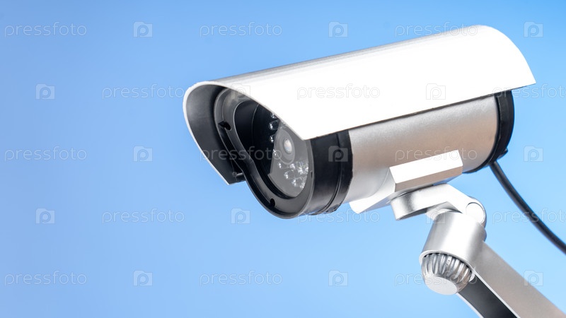 Белая камера видеонаблюдения на ясном голубом небе