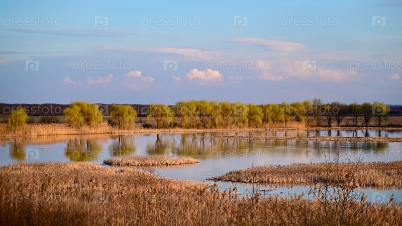 Апрель. Ивы и голубое небо с облаками отражаются в поросшем камышами озере. озере