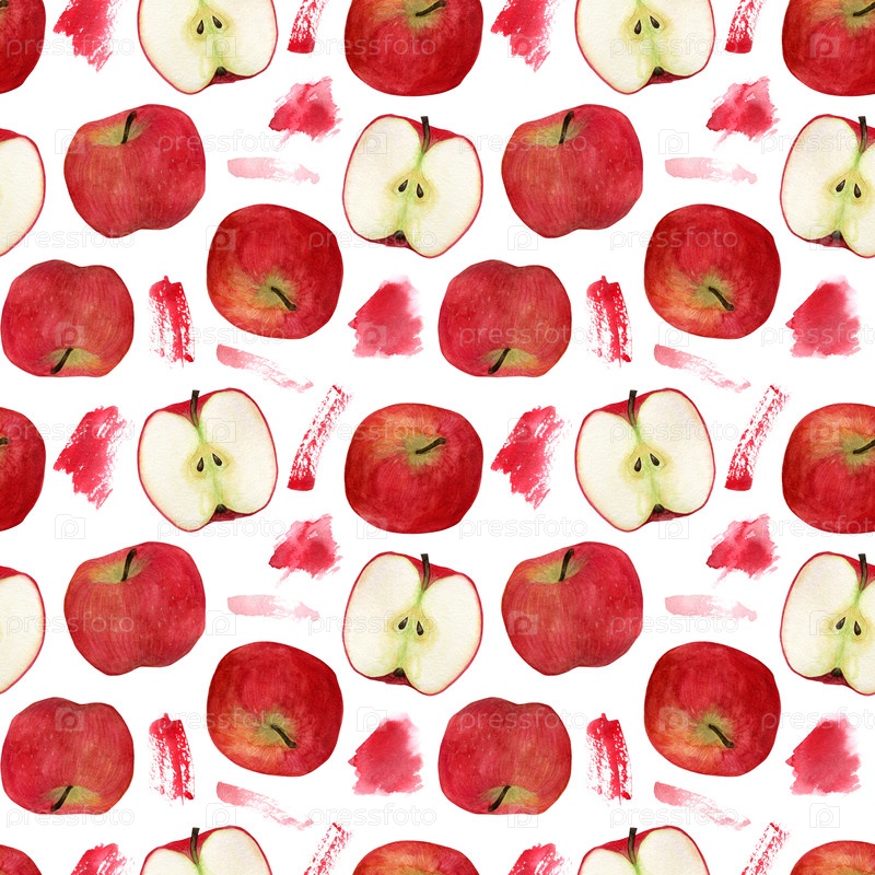 Акварель бесшовный шаблон. Красные яблоки и абстрактные пятна акварели на белом фоне. Ручная рисование. Дизайн для ткани, стеновых покрытий, открыток, приглашений, бумаги для скрапбуков или упаковочной бумаги