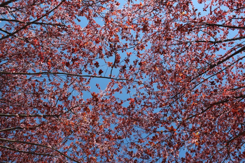 Вид снизу вверх на крону цветущей сливы Нигра (Prunus cerasifera) с красными листьями на фоне голубого неба