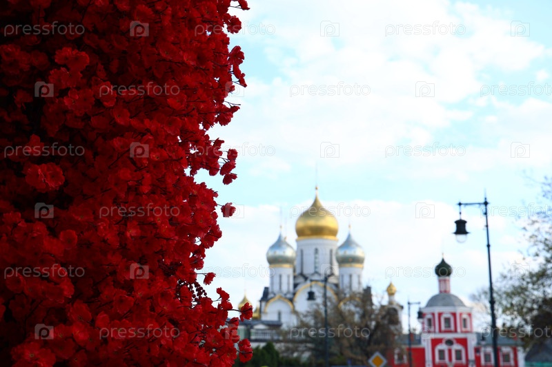 Успенский собор Московского Кремля на фоне красных цветов