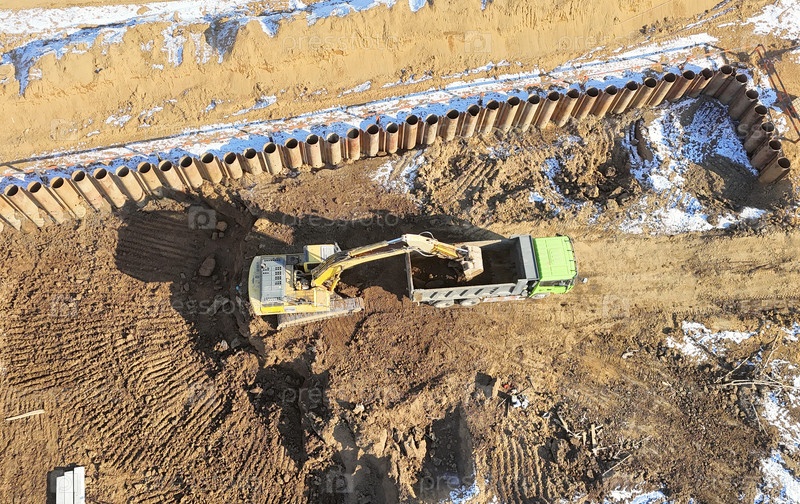 Погрузка груза земли во время раскопки фундаментальной ямы при строительстве здания вид с квадрокоптера