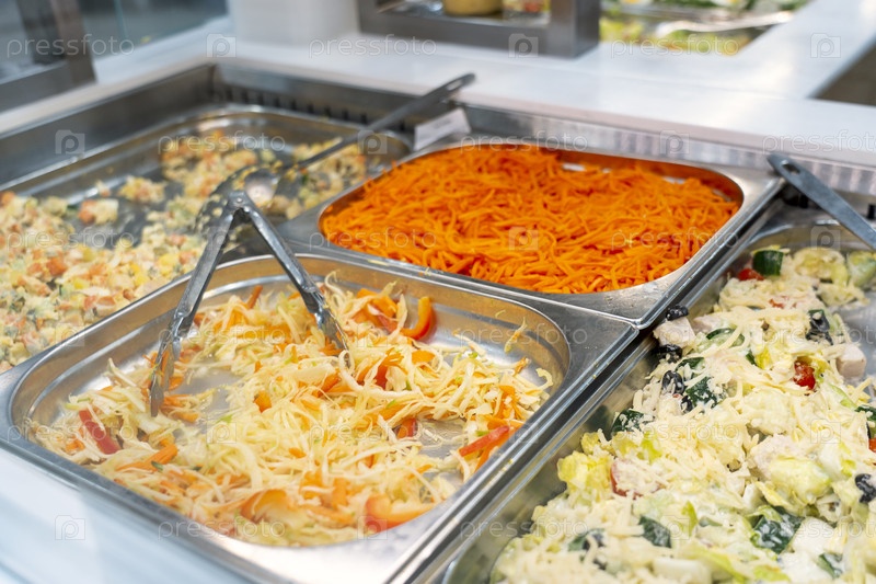 Морковь по-корейски, капуста по-корейски в магазине готовых к употреблению. готовые салаты на прилавке супермаркета