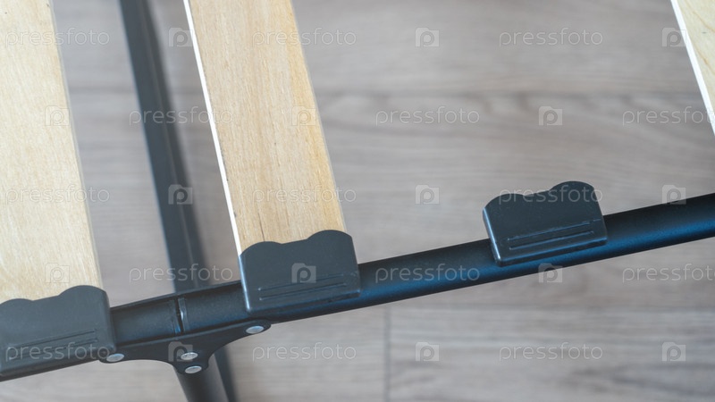 Сломанная ломелла вблизи кровати. сломленные деревянные лестницы на постели. сломленная ламелла древесная доска спальной мебели деталь элемента ремонта