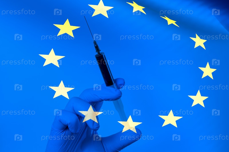 Подход Европейского Союза к фармакологии и медицине. Вакцина против коронавируса, COVID-19. Флаконы с вакциной и шприцы на фоне национального флага. Национальная фармацевтическая промышленность