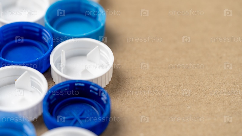 Ряд синих и белых пластиковых колпаков расположены на коричневой поверхности