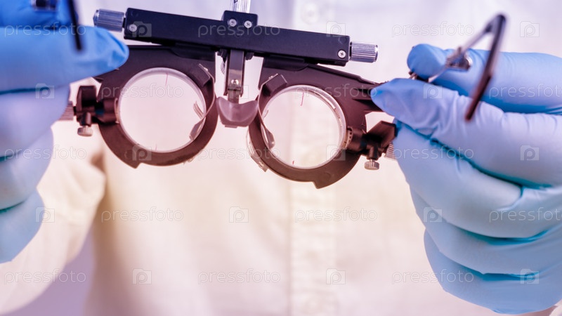 Руки в синих перчатках держат оптические устройства