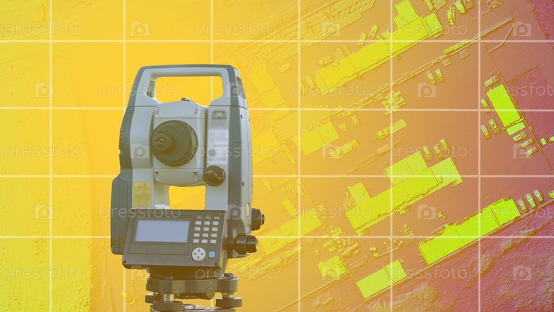 Геодезический инструмент на фоне строительных чертежей Строительная недвижимость Промышленная геодезия Макшадер