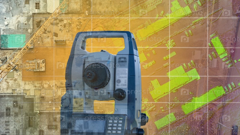 Современное геодезическое устройство на фоне рисунка.Строительство геодезического оборудования