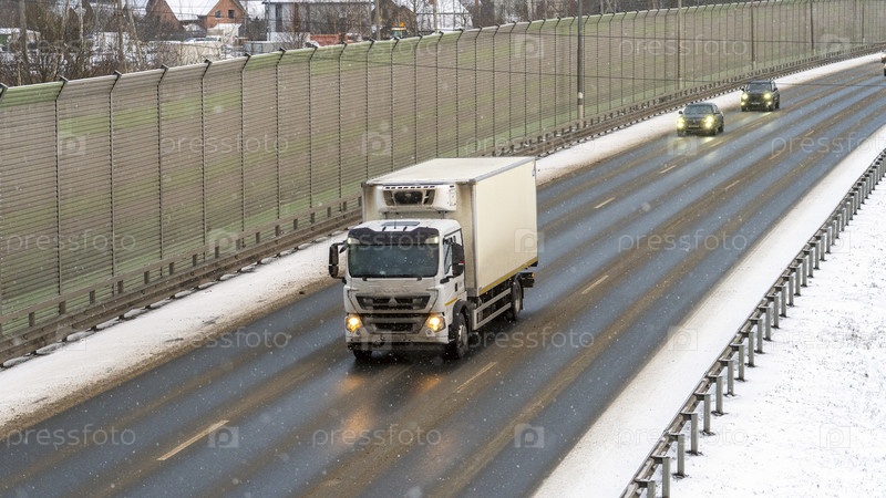 Москва, 20 января 2026, грузовик едет по снежной дороге. Грузовик белый и к нему прикреплен трейлер. На дороге еще два автомобиля, один за грузовиком и другой перед ним. Сцена тихая