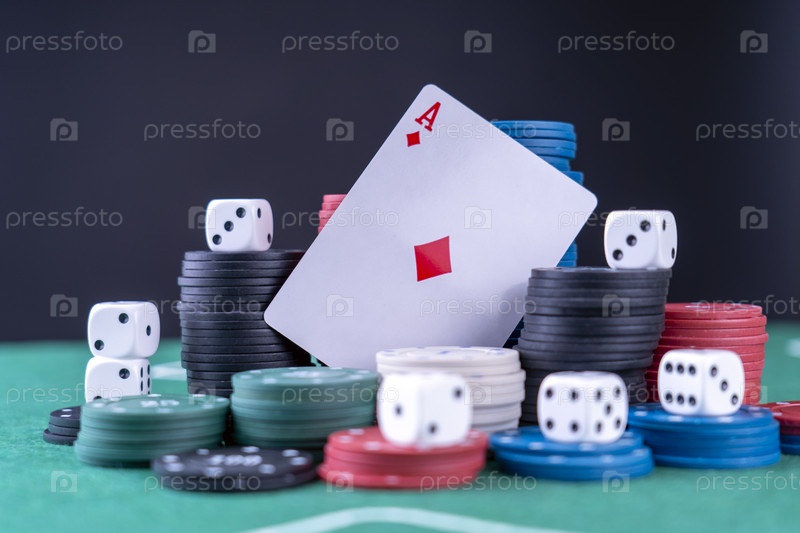 Карты, кости и игральные фишки на зеленом игровом столе