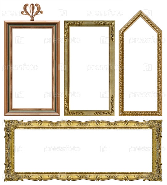 Набор золотых рамок для картин, зеркал или фотографий, изолированных на белом фоне