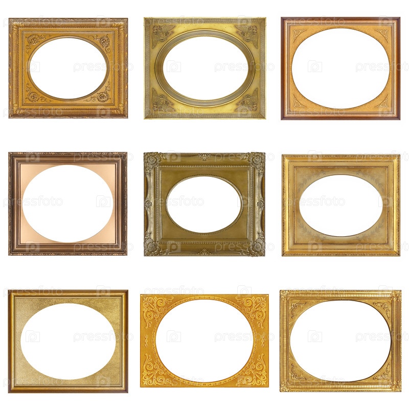 Набор золотых рамок для картин, зеркал или фотографий, изолированных на белом фоне