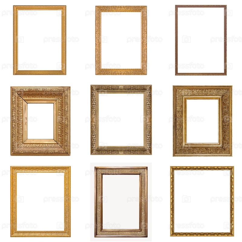 Набор золотых рамок для картин, зеркал или фотографий, изолированных на белом фоне
