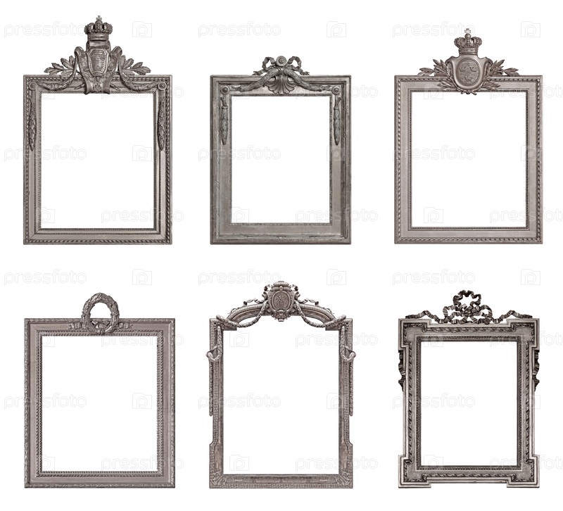 Набор серебряных рамок для картин, зеркал или фотографий изолированный на белом фоне