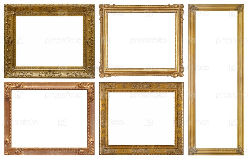 Набор золотых рамок для картин, зеркал или фотографий, изолированных на белом фоне