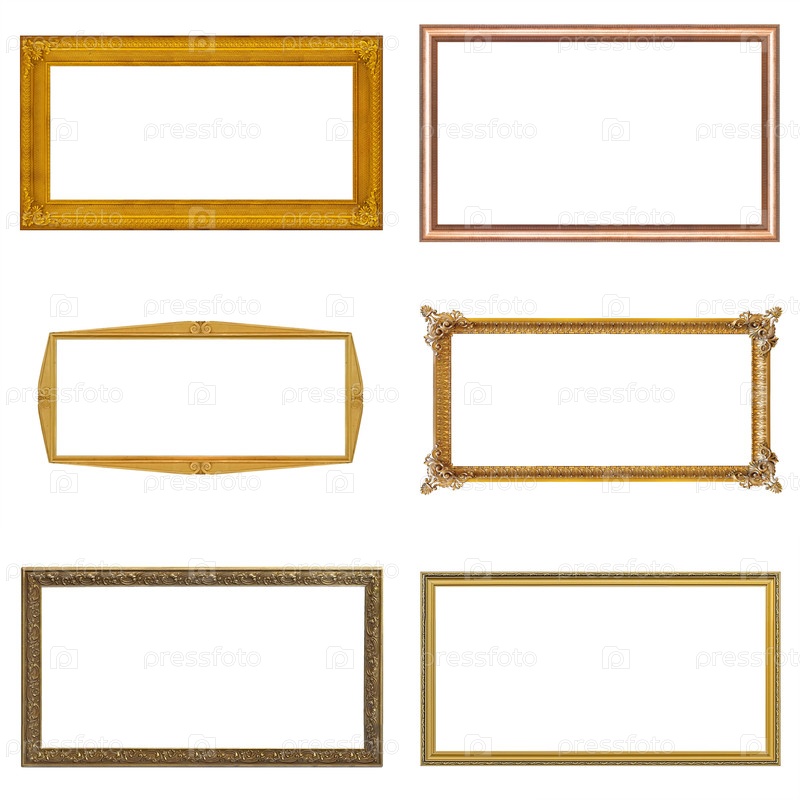 Набор золотых рамок для картин, зеркал или фотографий, изолированных на белом фоне
