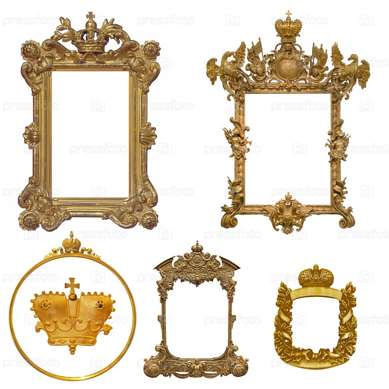 Набор золотых рамок для картин, зеркал или фотографий, изолированных на белом фоне