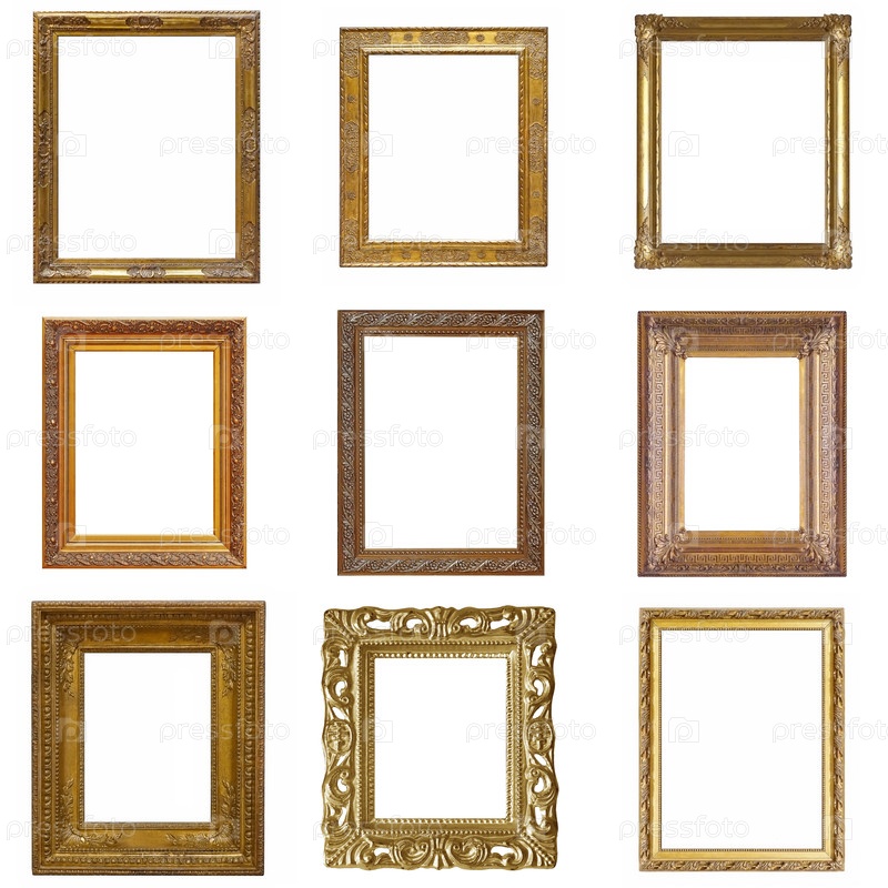 Набор золотых рамок для картин, зеркал или фотографий, изолированных на белом фоне