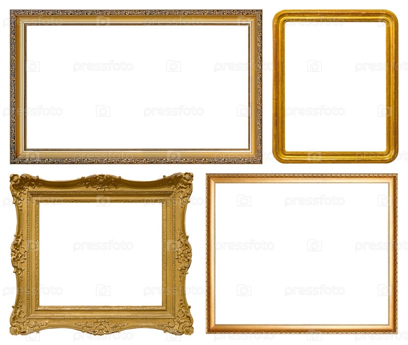 Набор золотых рамок для картин, зеркал или фотографий, изолированных на белом фоне