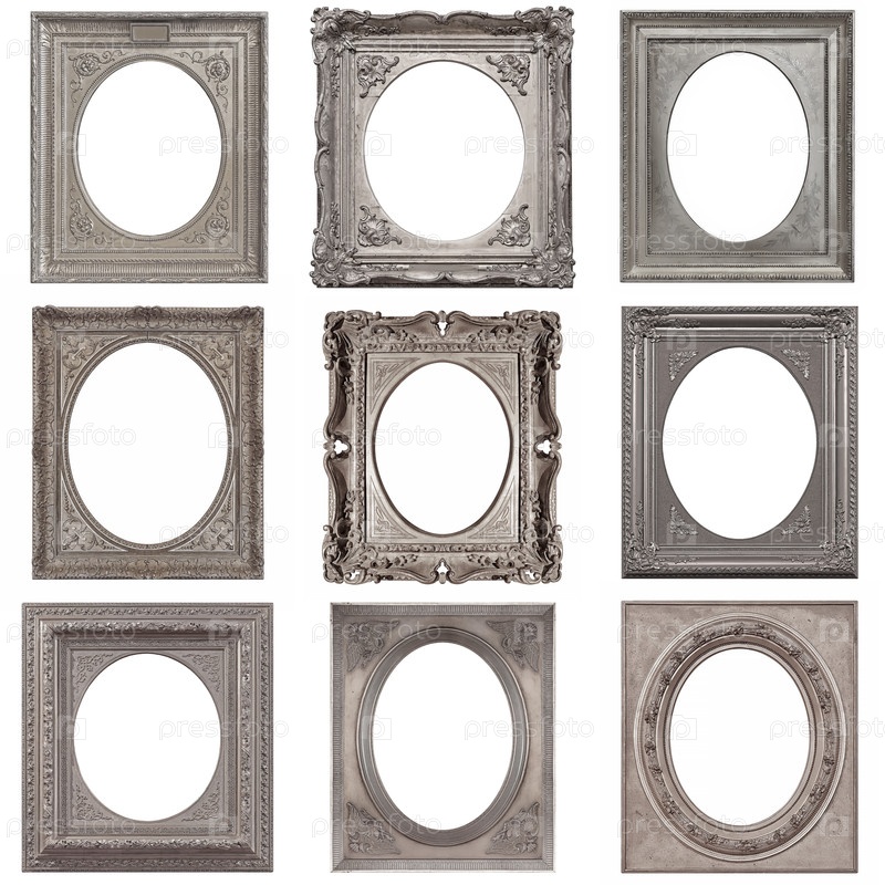 Набор серебряных рамок для картин, зеркал или фотографий изолированный на белом фоне