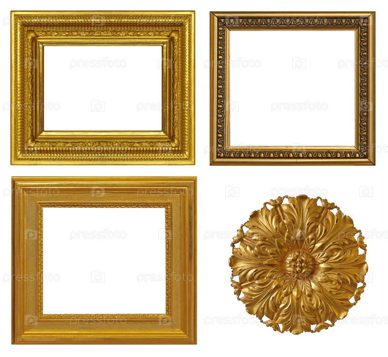 Набор золотых рамок для картин, зеркал или фотографий, изолированных на белом фоне
