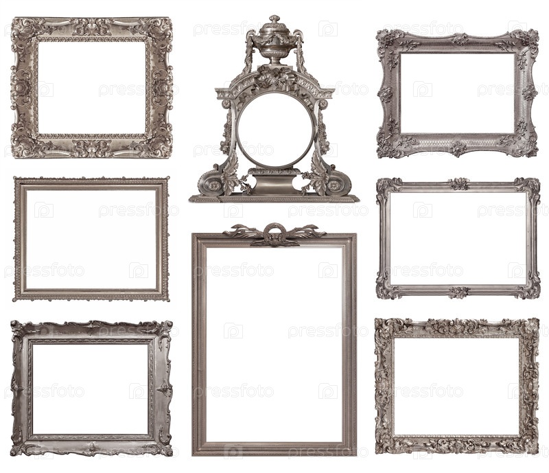 Набор серебряных рамок для картин, зеркал или фотографий изолированный на белом фоне