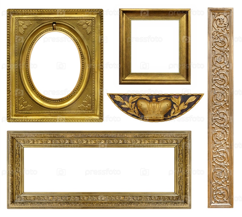 Набор золотых рамок для картин, зеркал или фотографий, изолированных на белом фоне