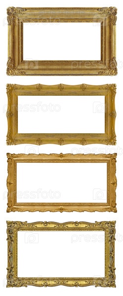 Набор золотых рамок для картин, зеркал или фотографий, изолированных на белом фоне