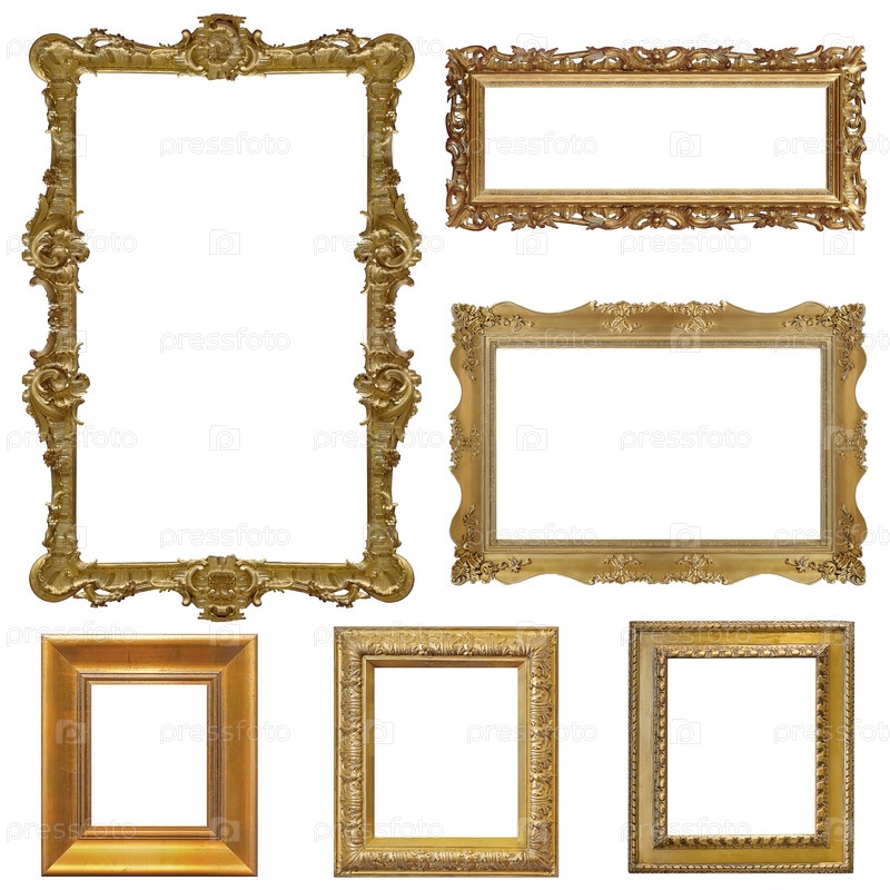 Набор золотых рамок для картин, зеркал или фотографий, изолированных на белом фоне