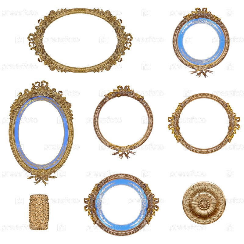 Набор золотых рамок для картин, зеркал или фотографий, изолированных на белом фоне