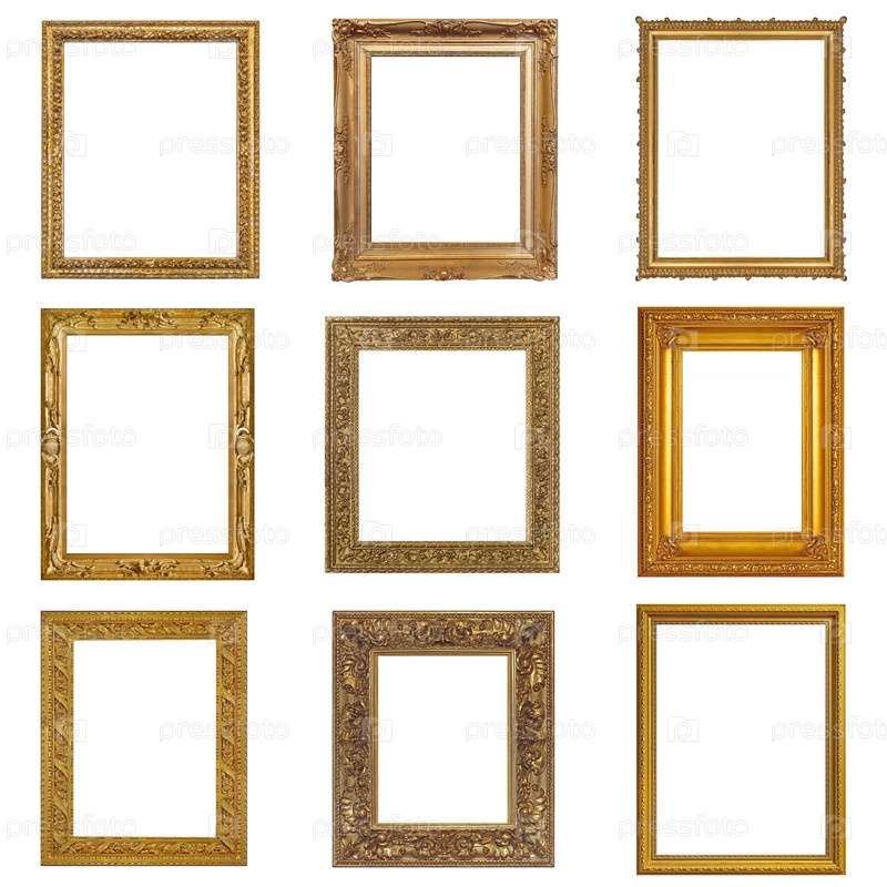 Набор золотых рамок для картин, зеркал или фотографий, изолированных на белом фоне