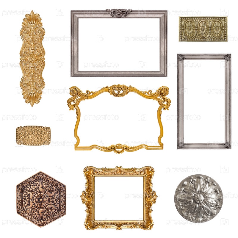 Набор золотых рамок для картин, зеркал или фотографий, изолированных на белом фоне