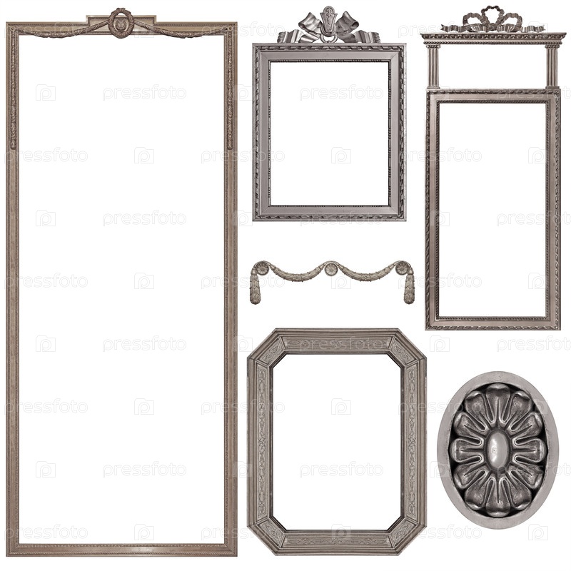Набор серебряных рамок для картин, зеркал или фотографий изолированный на белом фоне