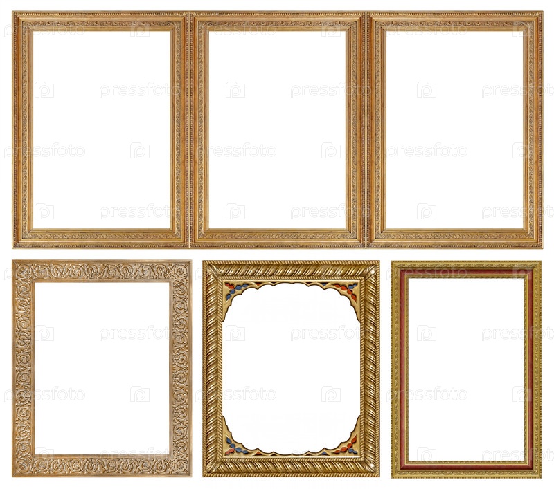Набор золотых рамок для картин, зеркал или фотографий, изолированных на белом фоне