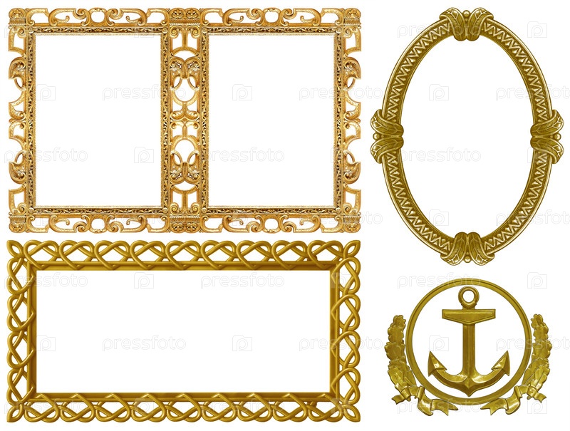 Набор золотых рамок для картин, зеркал или фотографий, изолированных на белом фоне