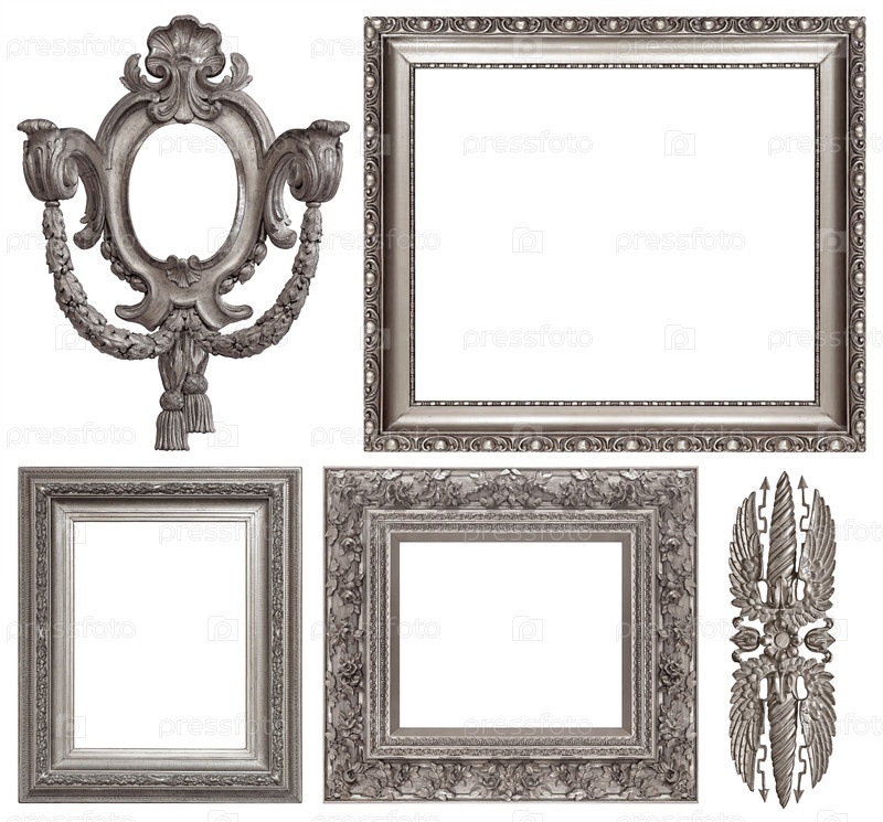 Набор серебряных рамок для картин, зеркал или фотографий изолированный на белом фоне