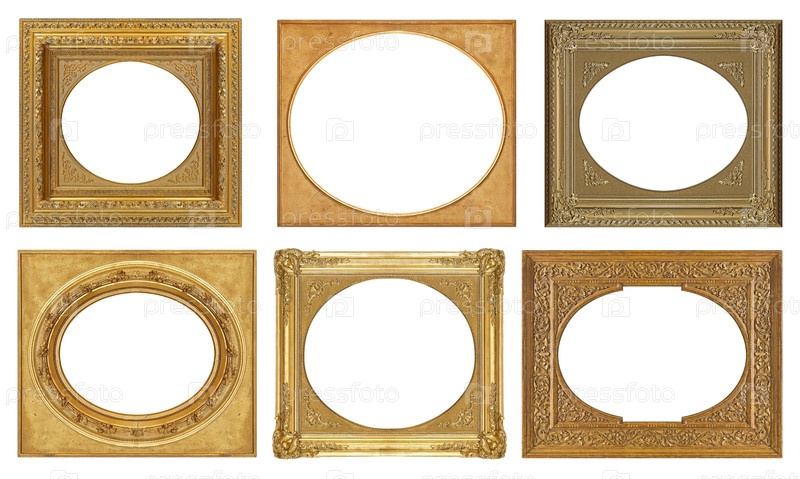 Набор золотых рамок для картин, зеркал или фотографий, изолированных на белом фоне