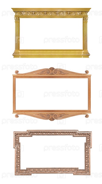 Набор золотых рамок для картин, зеркал или фотографий, изолированных на белом фоне