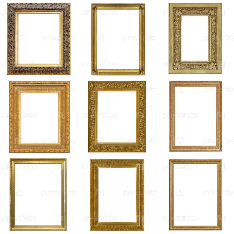 Набор золотых рамок для картин, зеркал или фотографий, изолированных на белом фоне