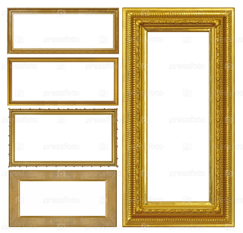 Набор золотых рамок для картин, зеркал или фотографий, изолированных на белом фоне